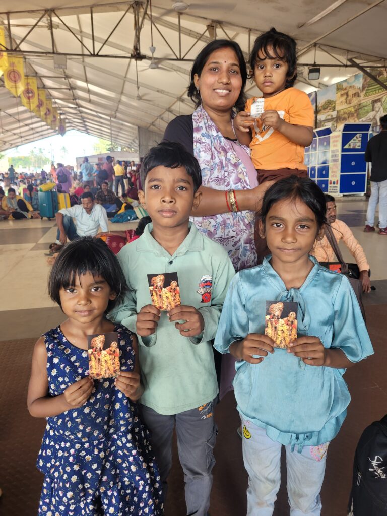 Next, I traveled to Vrindavan for the 50th anniversary celebration of the Krishna Balarama Mandir. To my surprise, at the Kolkata airport, I saw His Grace Jananivas Prabhu and his assistant walking toward the check-in counters—also going to Vrindavan. They had come from the Kolkata temple, and Jananivas Prabhu was adorned with a maha garland from the deities of Sri Sri Radha Govinda. Seeing me, he instantly removed the garland and kindly offered it to me. I felt this as a beautiful sign of reciprocation from Sri Sri Radha Govinda—a confirmation of Their satisfaction with the little preaching I had done in Their city. The lady at the check-in counter asked if I came from ISKCON Mayapur—she was so happy and friendly, and I just gifted her my book in reciprocation. So far, I remember I distributed two more books at the airport—one at a shop.