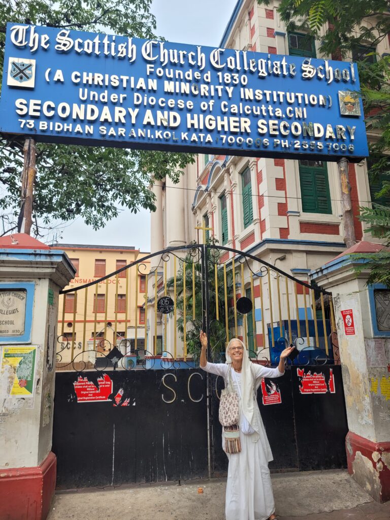 At the end of March, I spent a few days in Kolkata; simply stepping out of the hotel, the opportunity to distribute was right there. One day, I took a taxi to Ultadanga, visited Bhaktivinode Asan, and walked from there to the Scottish Church, where Srila Prabhupada once studied. Along that road, English-speaking people were rare, yet from time to time, I found opportunities to share my book. I carried Hare Krishna mantra cards in Bengali, always able to offer something. My heart felt deeply content walking the paths Srila Prabhupada must have taken. The old buildings and simple lifestyle made the experience truly special.