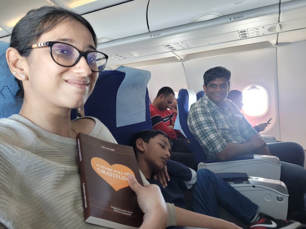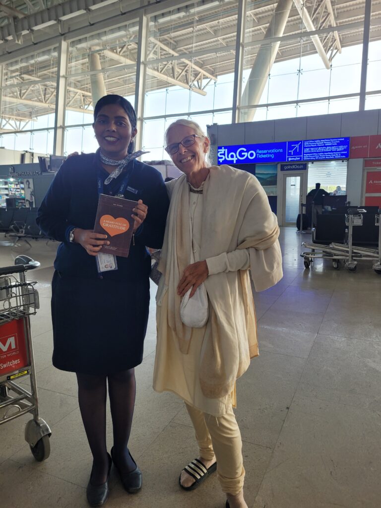 Despite any circumstances, when we continue sharing Krishna consciousness, everything falls into place, especially when we understand who is ultimately in control. With that awareness, we remain undisturbed and taste the sweetness of transcendental bliss. Strange to say, but it is true, it was one of my highlights missing that flight! Because Krishna chooses these two particular souls to get some mercy—My luck was to be used as His instrument—despite I missed out on the direct flight, etc.