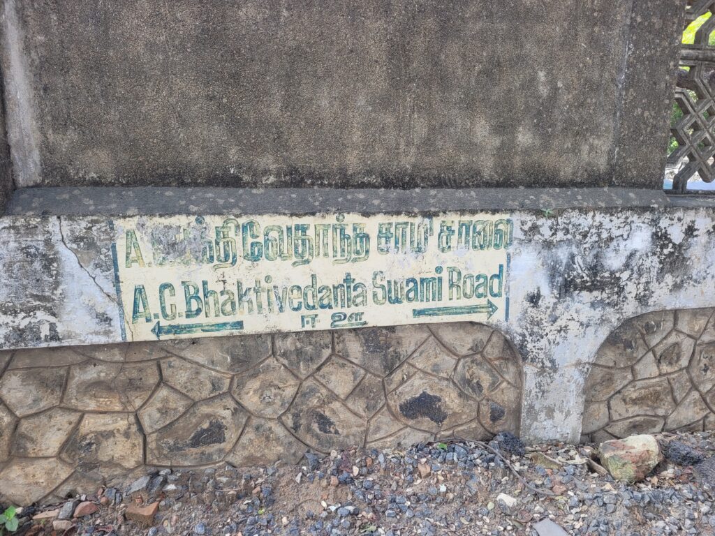 “A. C. Bhaktivedanta Swami”. Aside from road signs, it is also written on a wall, “A. C. Bhaktivedanta Swami Road” along with Tamil.
