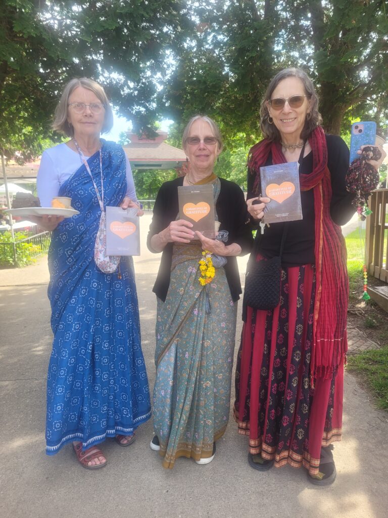 As always, I had my book with me. One day, during the Srimad-Bhagavatam lecture, five of Srila Prabhupada’s disciple Matajis were sitting in chairs right in front of me. Since I had exactly five books in my bag, I thought it was a wonderful opportunity to gift one to each of them—and so I did after the lecture. Their Graces Gopalasya Priya, Kutila, Lajjavati, Ruci, and Krishna Bhava Mataji were all surprised and grateful. In this way, I began a good connection with them, which unfolded in different ways during my stay at the New Vrindavan farm. How much I wished I had taken a photo of all five together—but I caught up with that desire as best I could by meeting some of them again after breakfast.