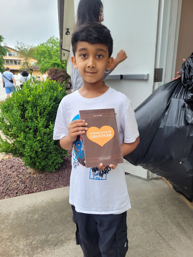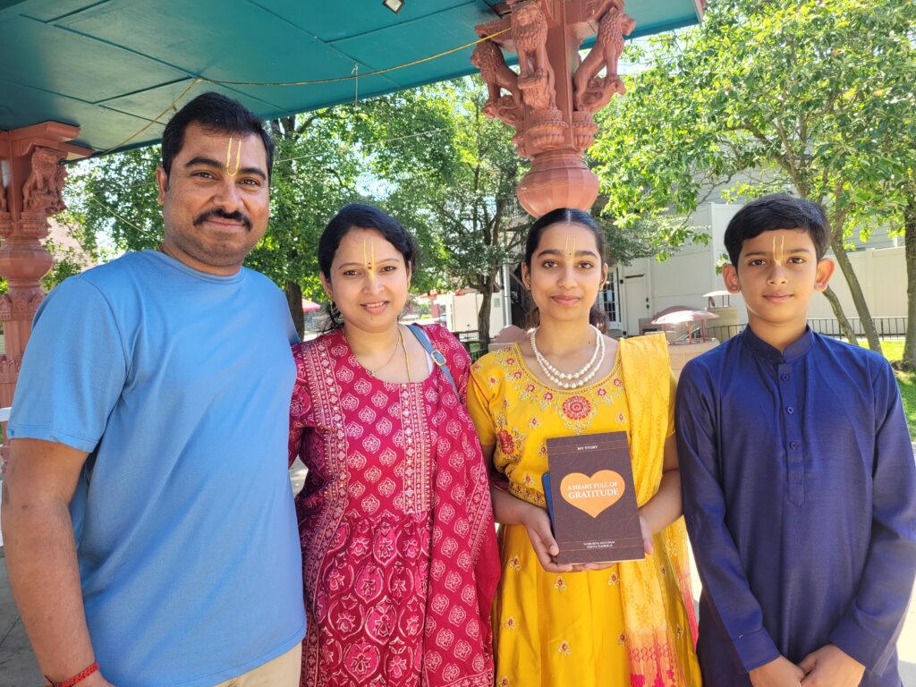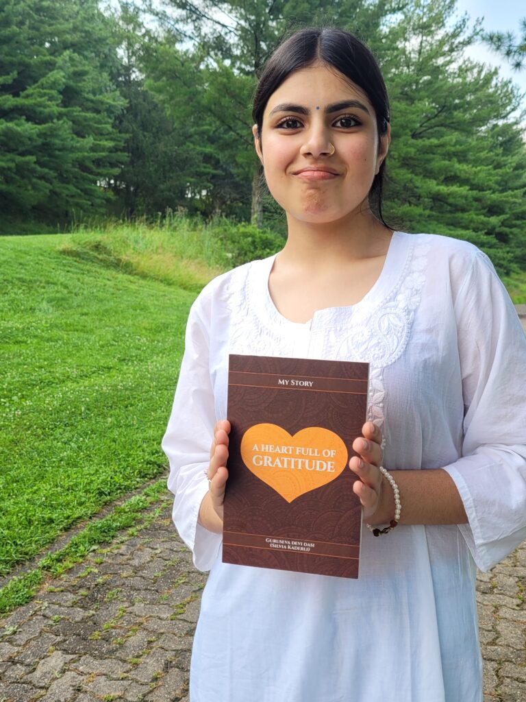 Last year, Jahnavi and Madhurika were invited for the first time to New Vrindavan for the 24-hour Kirtan. At that time, they told me I should also go there one day. So, I took the opportunity to accompany them, and I sent three boxes of my book (150 copies) in advance to Anuradha Mataji, the wife of the temple president, Jay Krishna Prabhu.