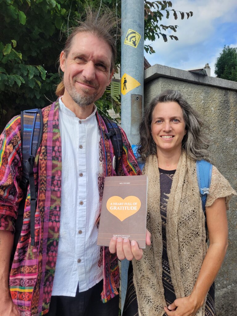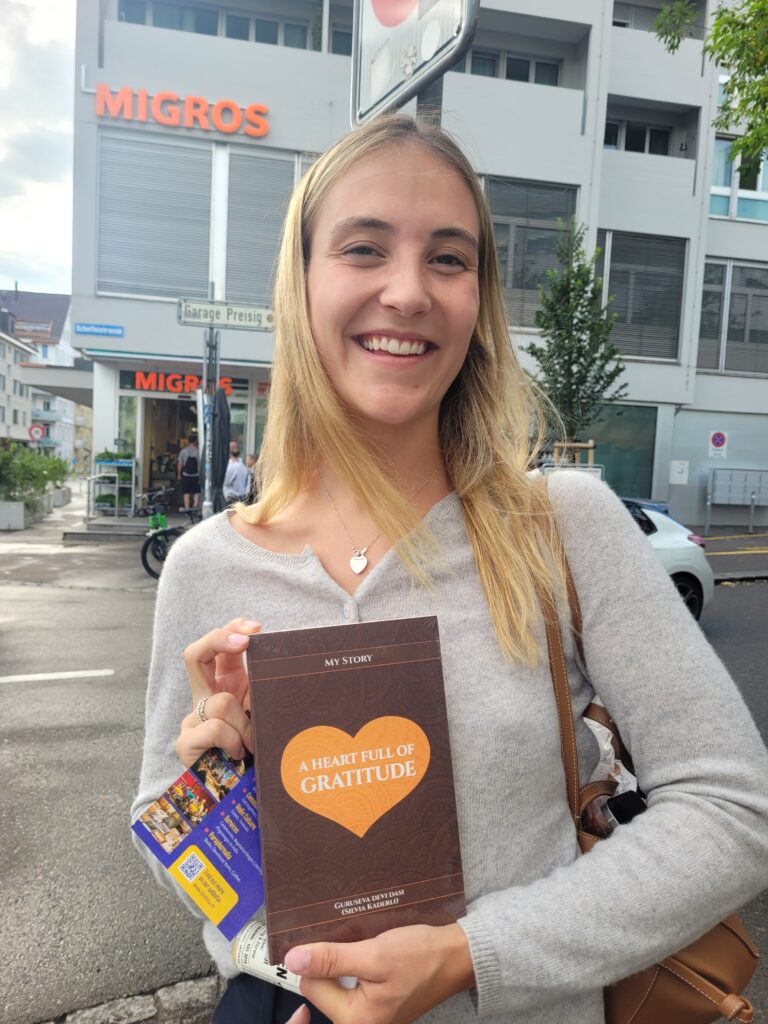 In Switzerland, we all stayed in Vanamali’s son’s flat in Herzogbuchsee, near Bern, for which we were very grateful. Being within walking distance of the train station was a great advantage for us. I could simply step out of the house and begin distributing my book along with various paraphernalia—such as incense and beautiful handmade cards created by Madhurika.